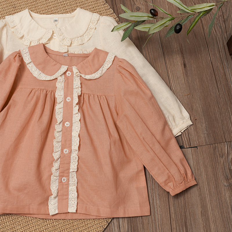 子供のコントラストカラーラペルベビードールシャツ 25 春と秋のデザインレースステッチ子供シャツパフスリーブ日本トップ