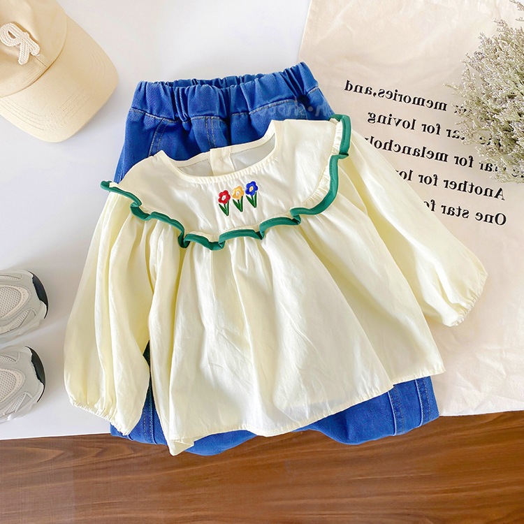 2022女の子ニット刺繍ベビー襟トップス子供用洋風ボトムシャツデニムバックパンツ2点セット新作