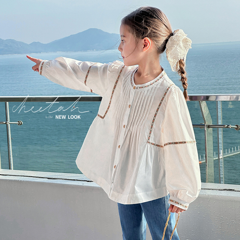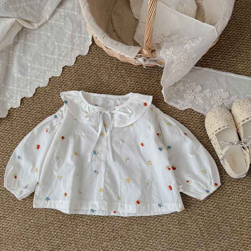 麦畑シーズン2023春秋新作韓国女の子ベビー襟シャツ子供刺繍レース襟長袖シャツ
