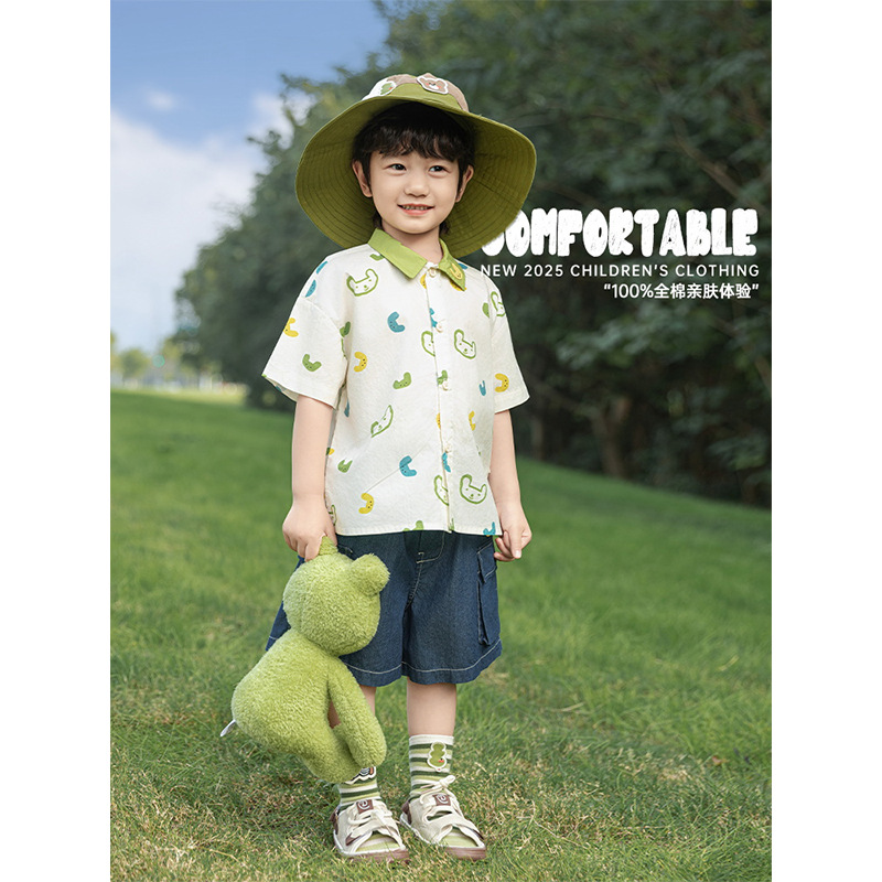 吾里卜一男児2025夏の新型熊満印衝突色襟シャツ清涼デニム半ズボンセット