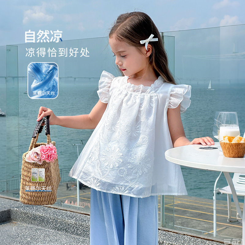図図小象童装シャツ2025夏新女児天糸刺繍甘美童シャツ小飛袖親子シャツ