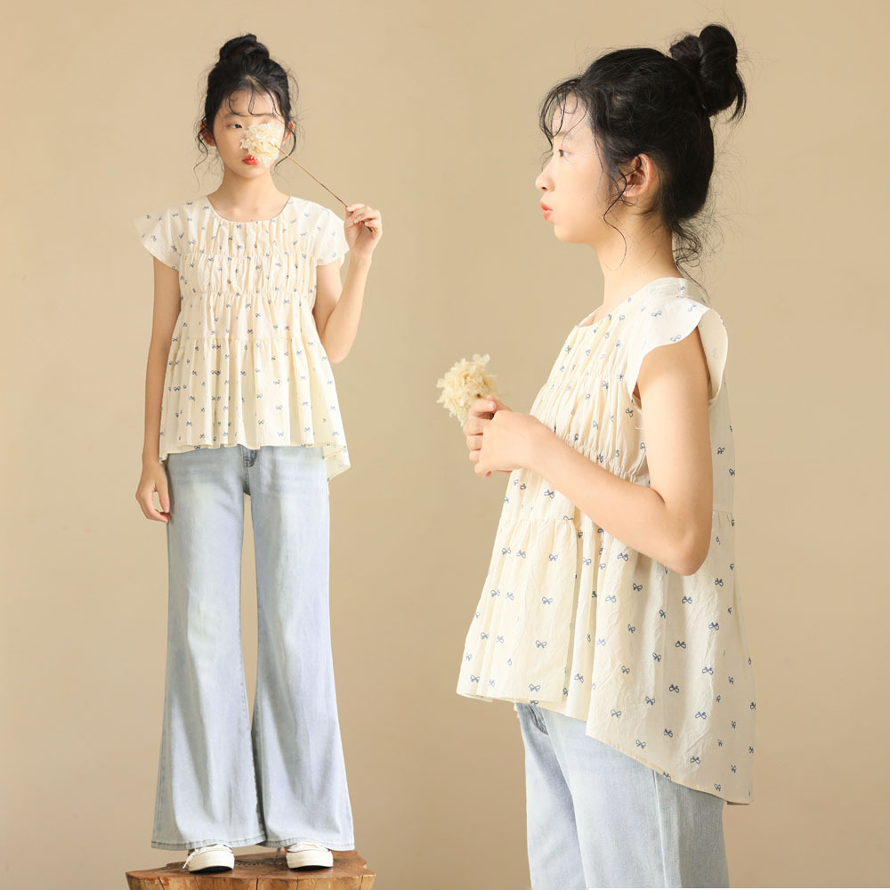 フレンチフローラルドールシャツ女の子夏の新しいフライングスリーブラウンドネックシャツルーズプリーツ甘い年齢を軽減するコットントップ