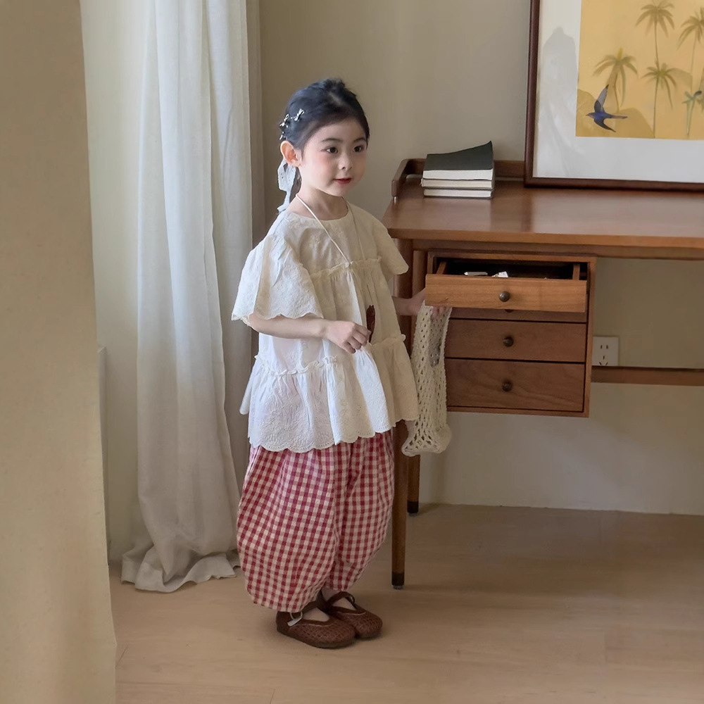 日系の女の子のシンプルなレースの方襟杏色の子供シャツ2024夏の子供のゆるい上着の高品質メーカー