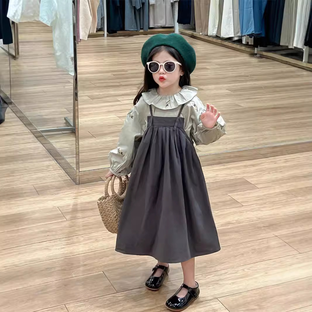2024秋の新型韓国版子供服女の子レトロ刺繍泡袖子供シャツサスペンダースカートワンピース