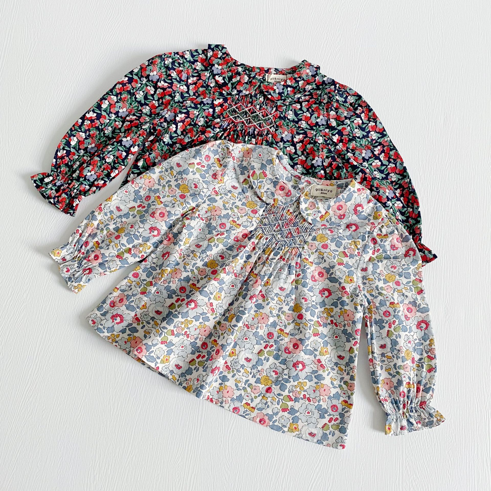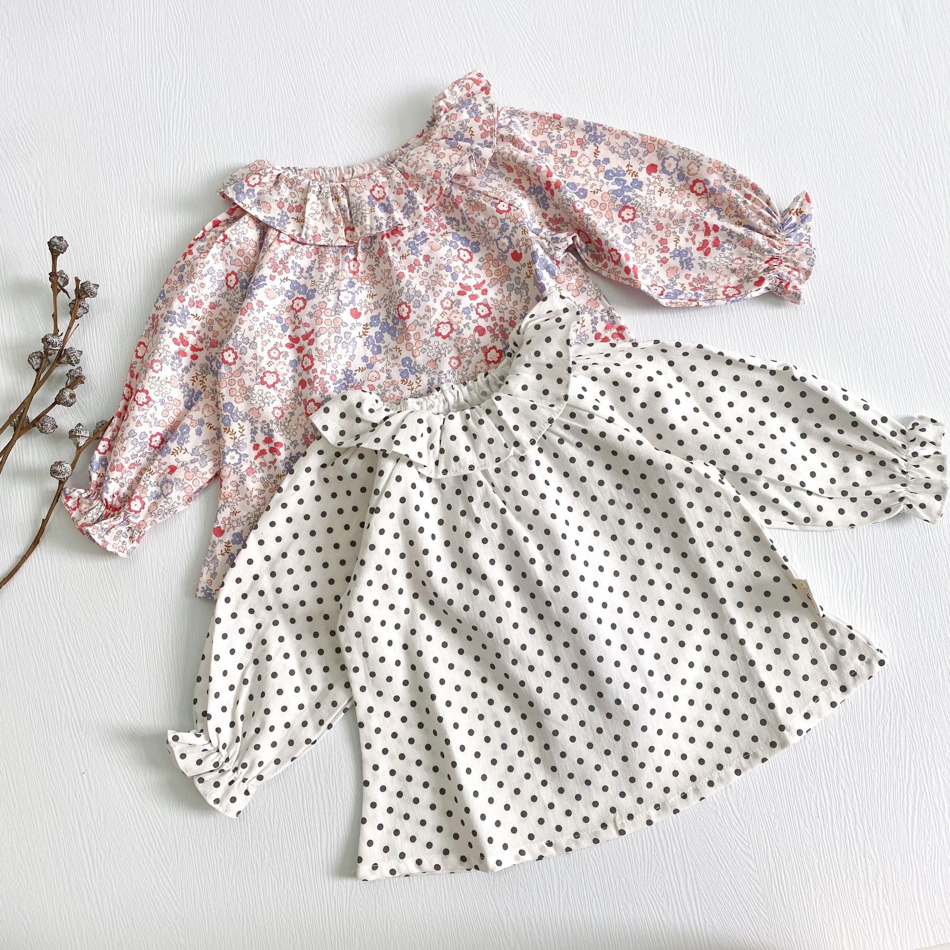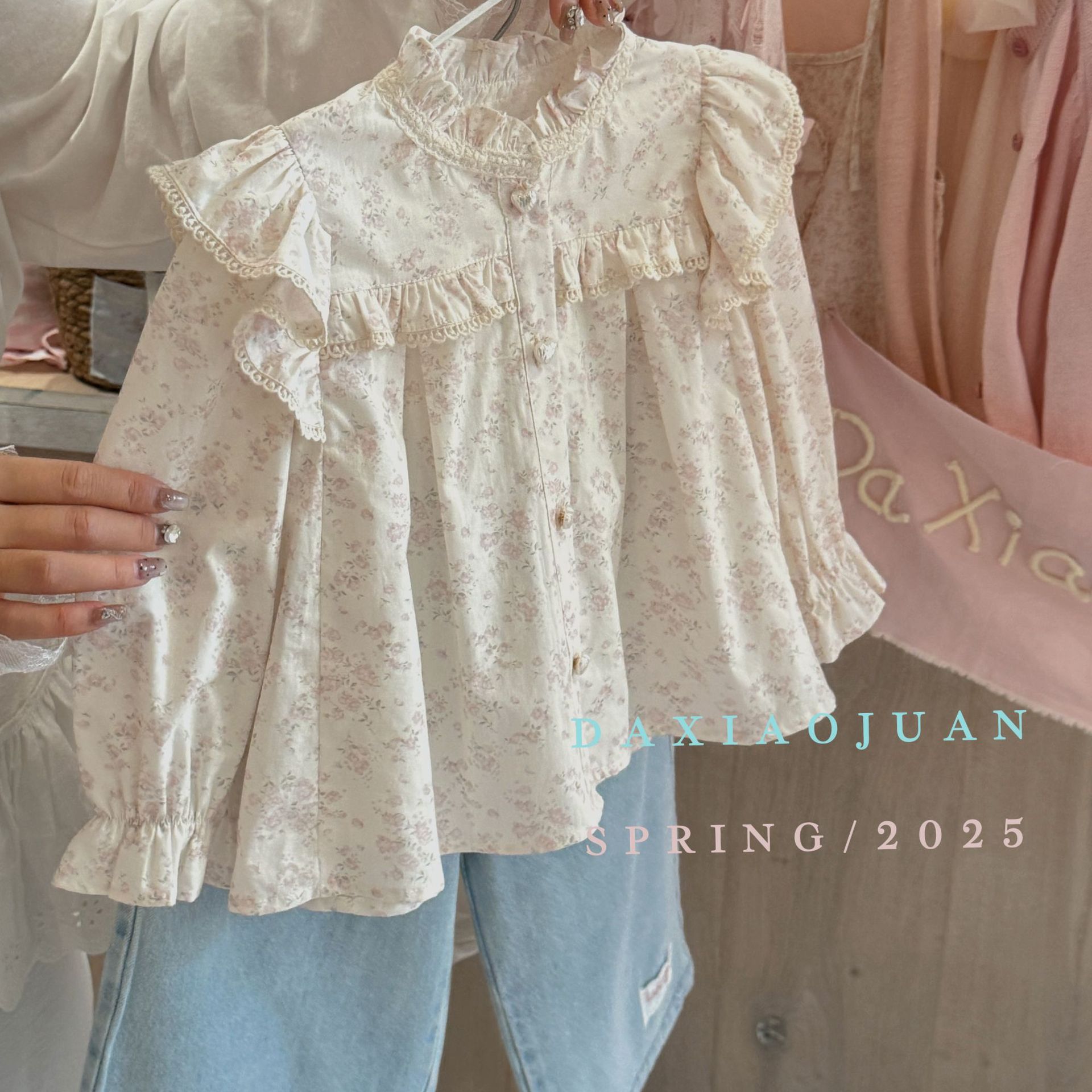 在庫あり 大小ロール25春夏モデル 立ち襟長袖花柄女児ワンピース ガーリー風韓国プリンセスブラウス