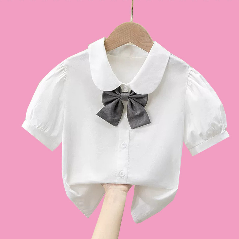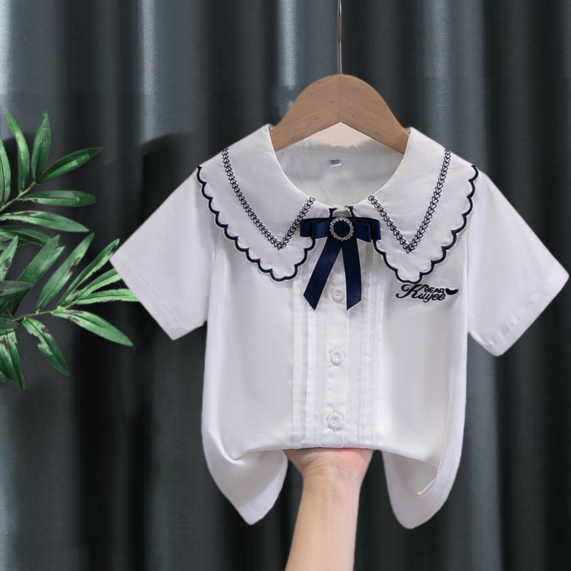 子供用半袖薄手女子学生白シャツカレッジスタイルトップスドールカラーシャツ夏アウター万能リボン