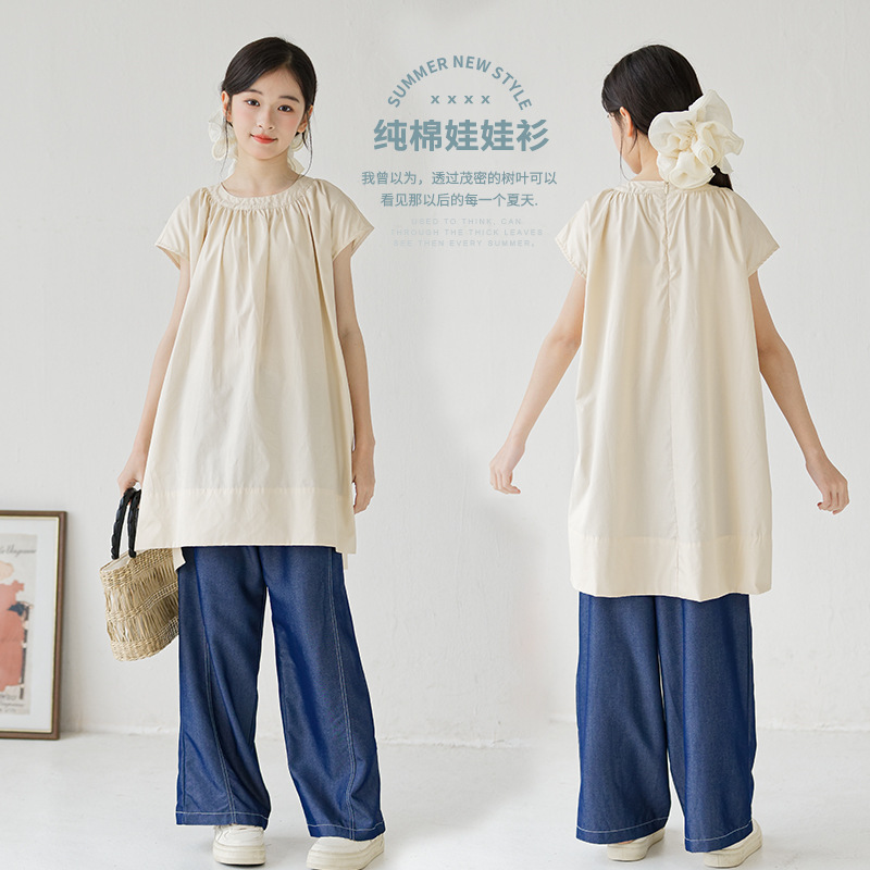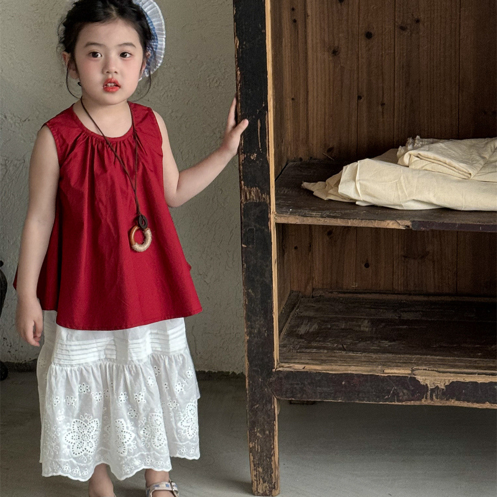 女の子の夏の袖なしの子供のシャツ2025の新型の大きい女の子の長い積み重ねは純綿の百合のシャツの親子服を着ます。