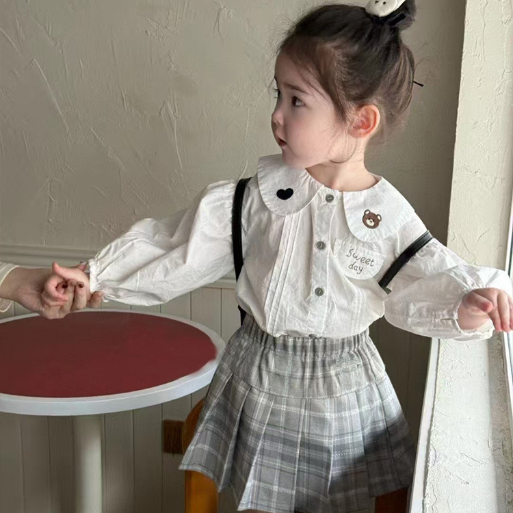 ベビードール襟シャツとチェック柄プリーツスカートのツーピースセット、2025年秋の新作、おしゃれな女の子向けカレッジスタイルスーツ