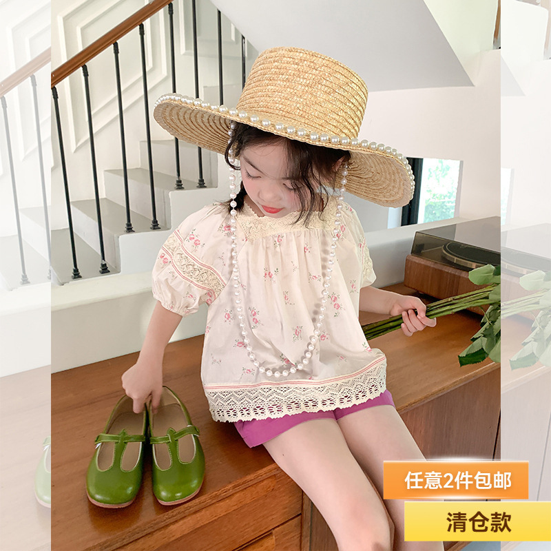 [在庫一掃] 女の子ニッチ気質レース花柄シャツエスニックスタイルスクエアカラー半袖ベビードールシャツトップ