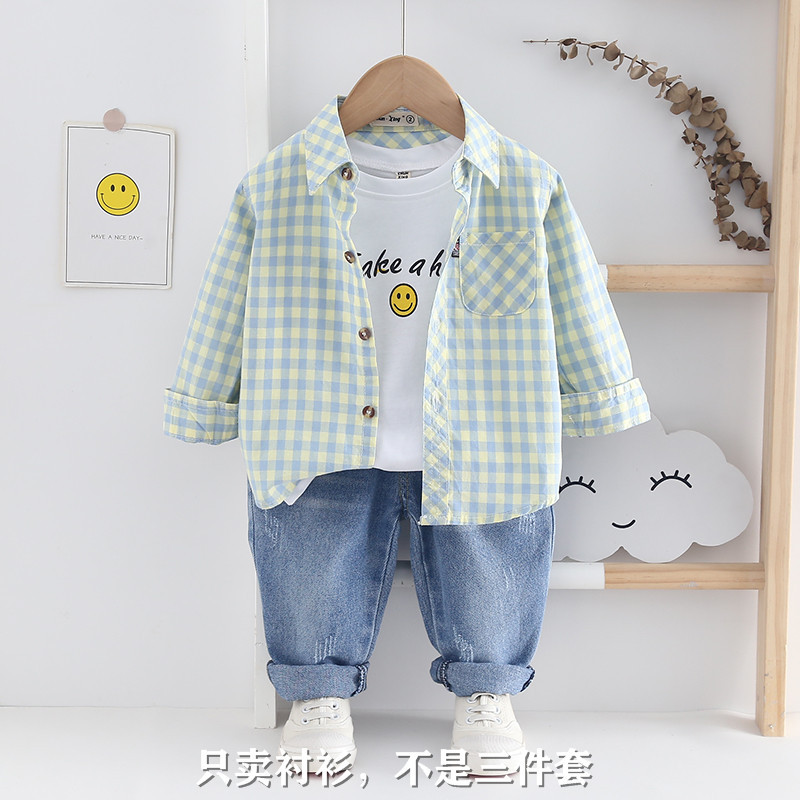 子供用シャツ純綿男児用シャツ長袖折り襟2024春秋服中小童チェックシャツ上着