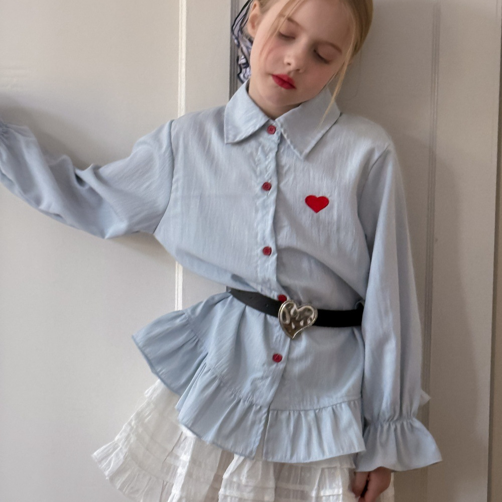 刺繍ラブガールズ 2025 韓国秋の新作ルーズレースシャツスカート中大型子供用フリルシャツ