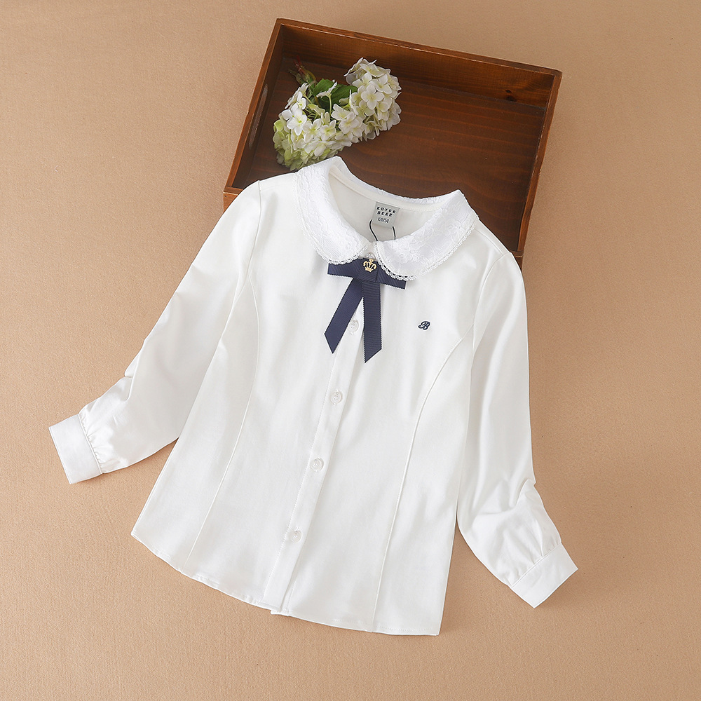 女の子用長袖シャツ 秋冬 リボン付きレース襟 カレッジスタイル 綿100%トップス 子供用シャツ 大きな襟