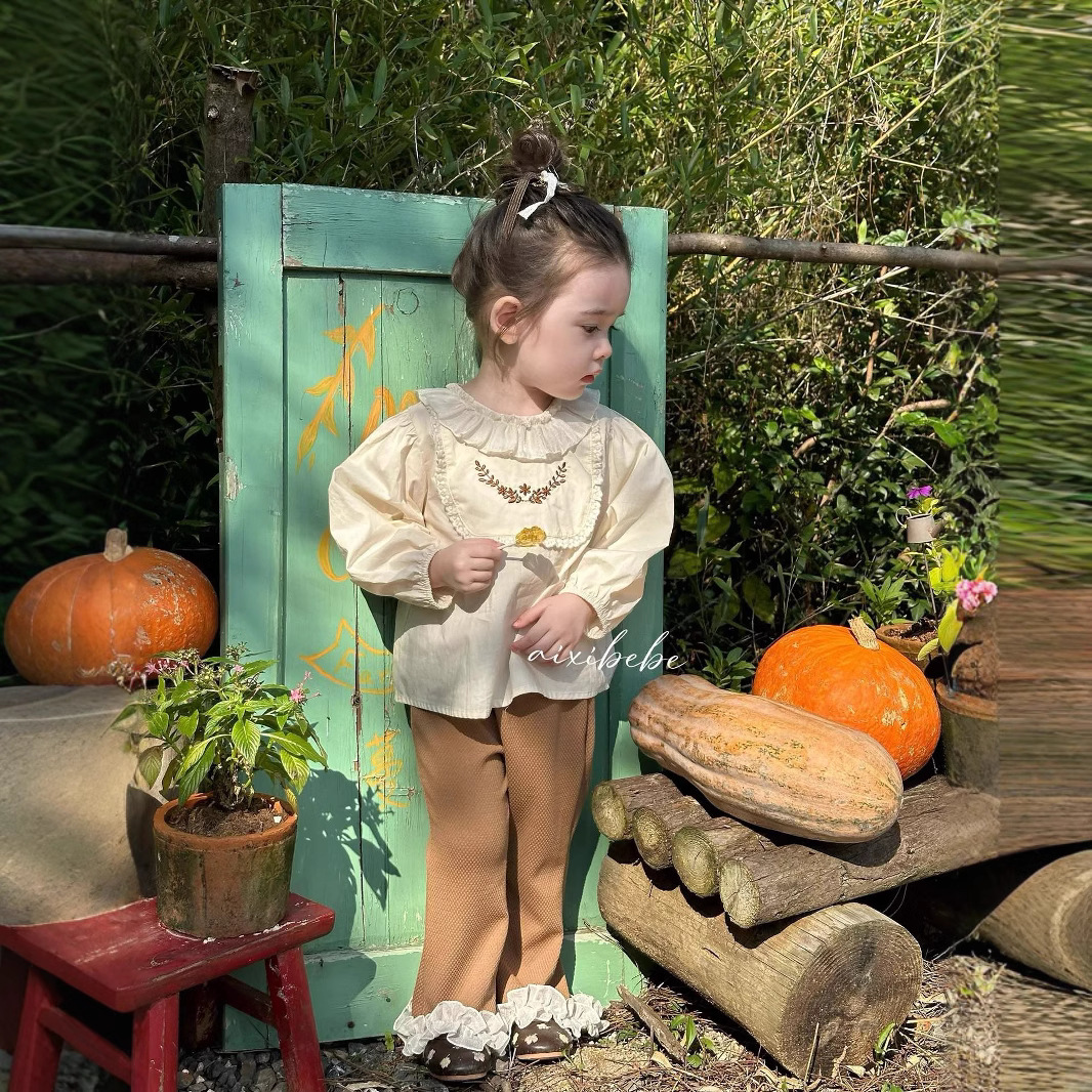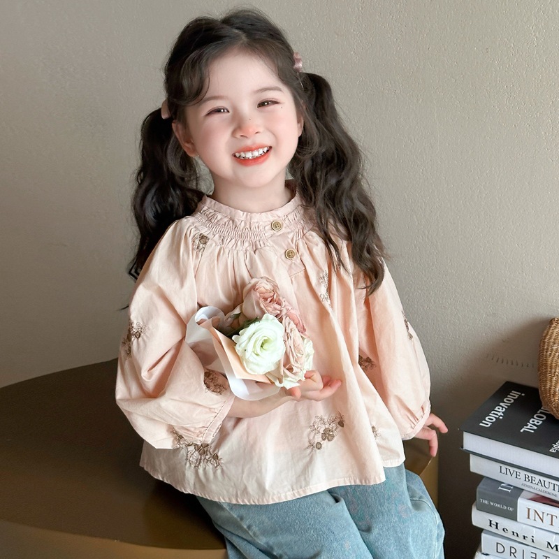 女の子韓国風刺繍ラウンドネックシャツ 2025 秋の新作ベビーかわいいプルオーバー綿刺繍人形シャツトレンディ