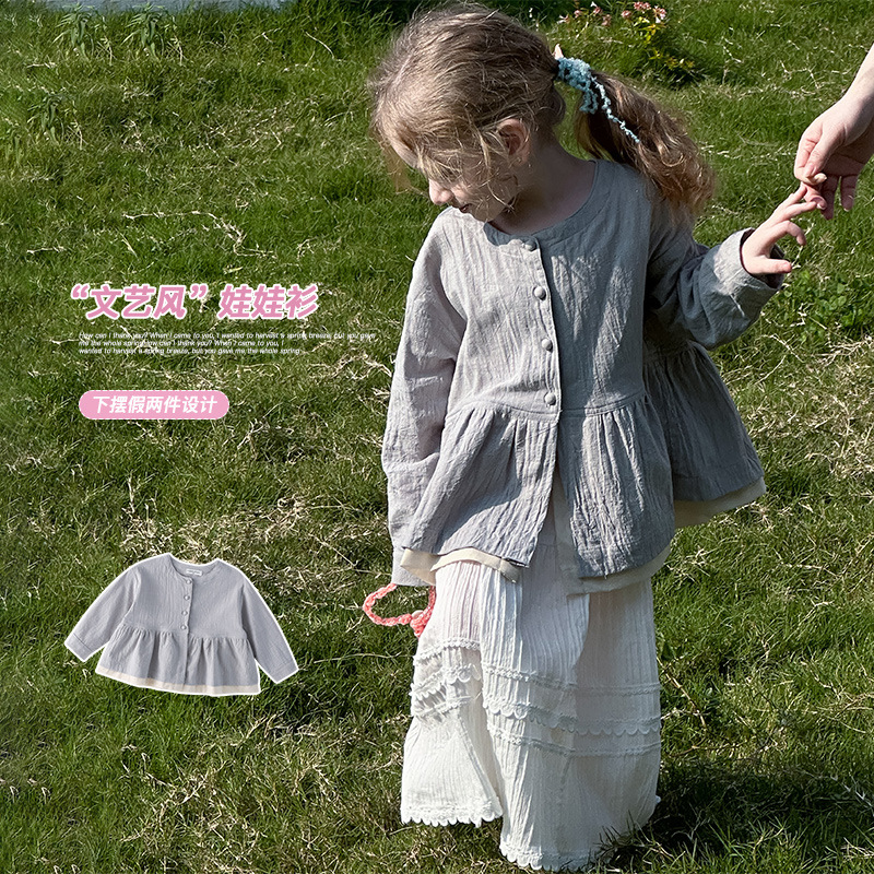 女の子のシャツ春2025の新型子供服の女の子のハスの葉の辺の子供のシャツの赤ちゃんの長袖の上着の偽の2枚