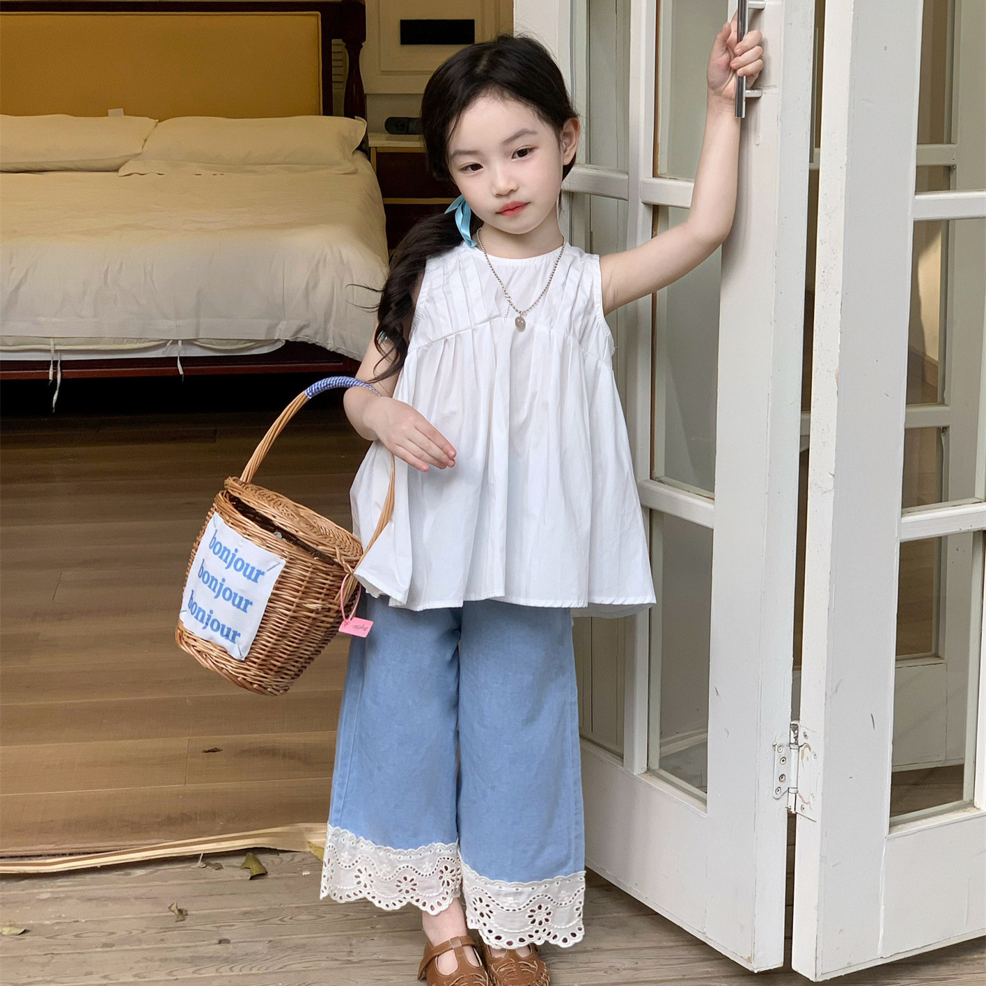 2025夏の新型女の子の袖なしのゆったりしたシャツの子供のシャツの韓国版の洋風の薄いタイプのレースのジーパン