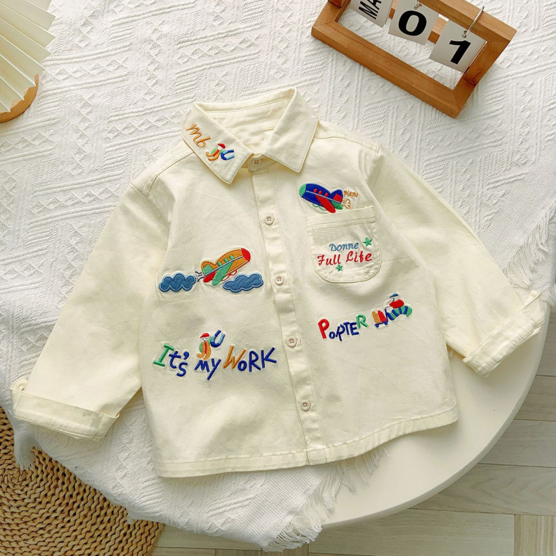 2025 日本の子供用長袖シャツ男の子刺繍クマ飛行機ラペルトップベビーシャツ