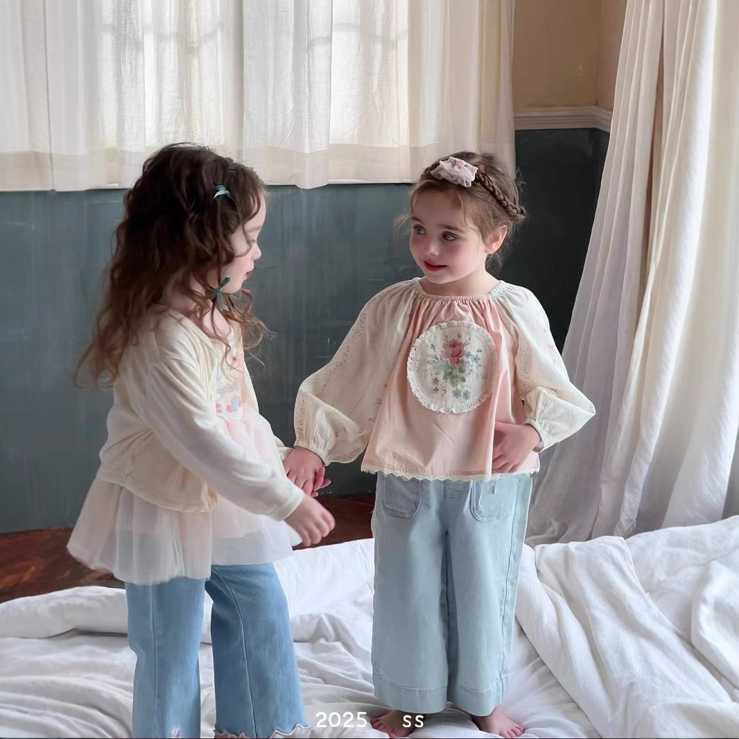 子供の韓国版のシャツ2025春の新型の女の子の甘い妹の方襟の子供のシャツの上着の百合のゆったりしているジーパン
