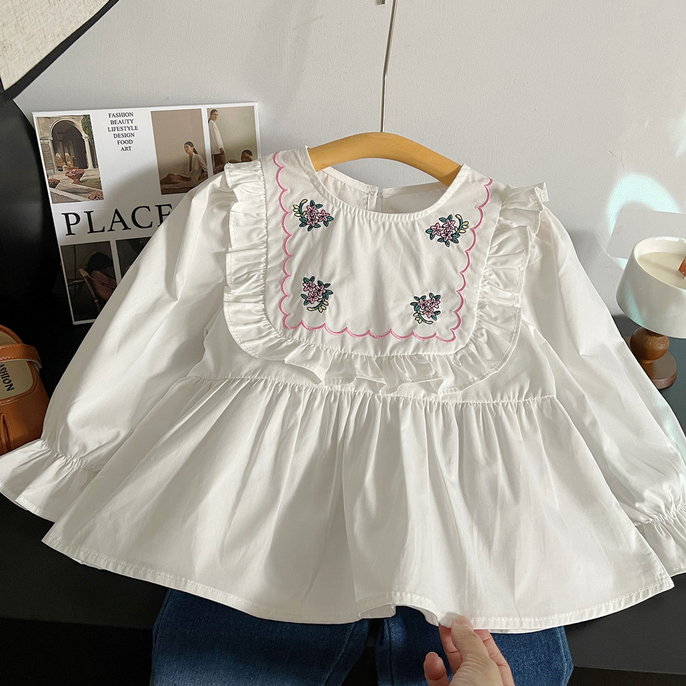 現物は国境を越えて女の子の子供のシャツの春秋冬の森系の復古の刺繍の女性の赤ちゃんの長袖の白いシャツの純綿です。