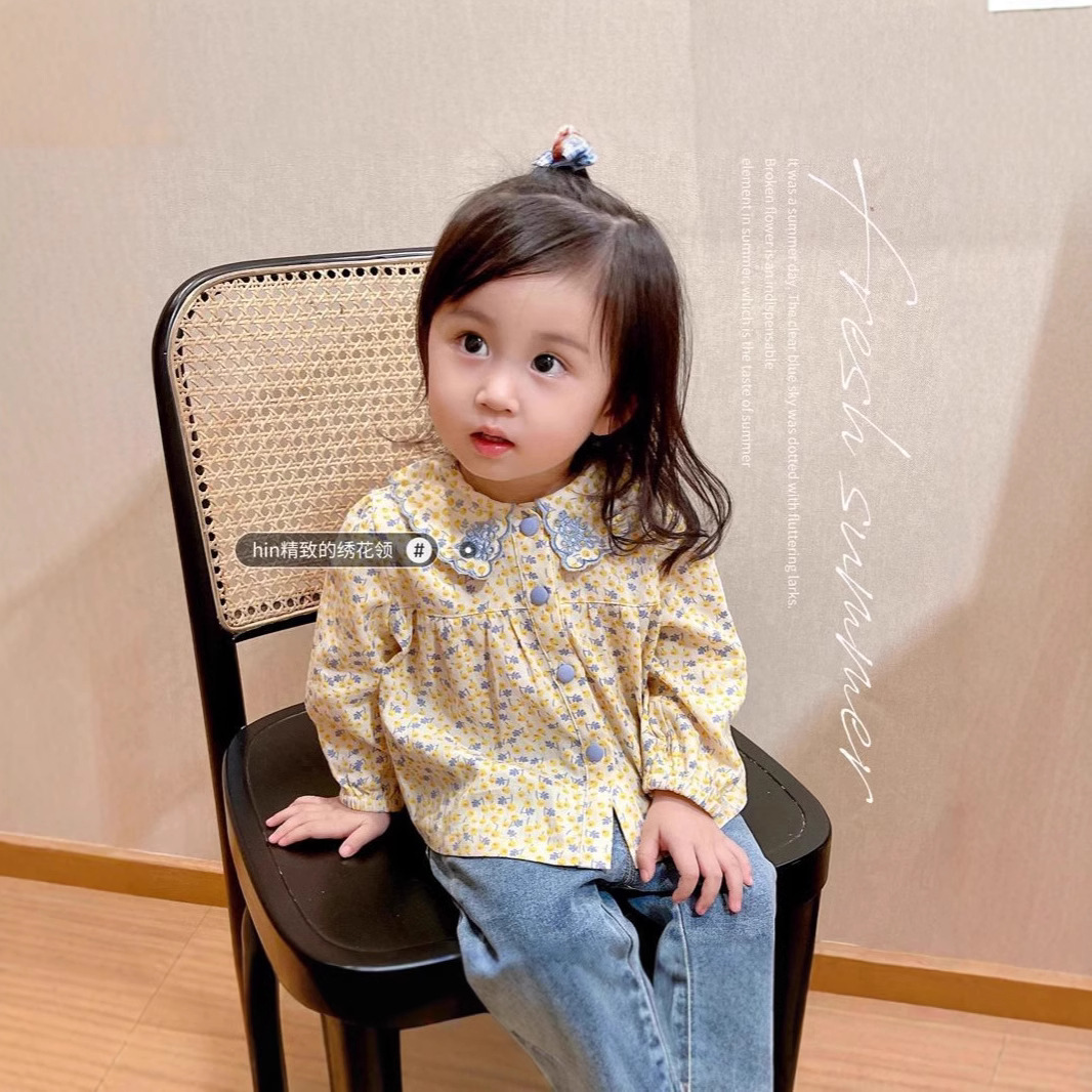韓国子供服女の子花柄シャツトップス新しい子供デニムベルボトムベビーガール人形シャツ春と秋の服