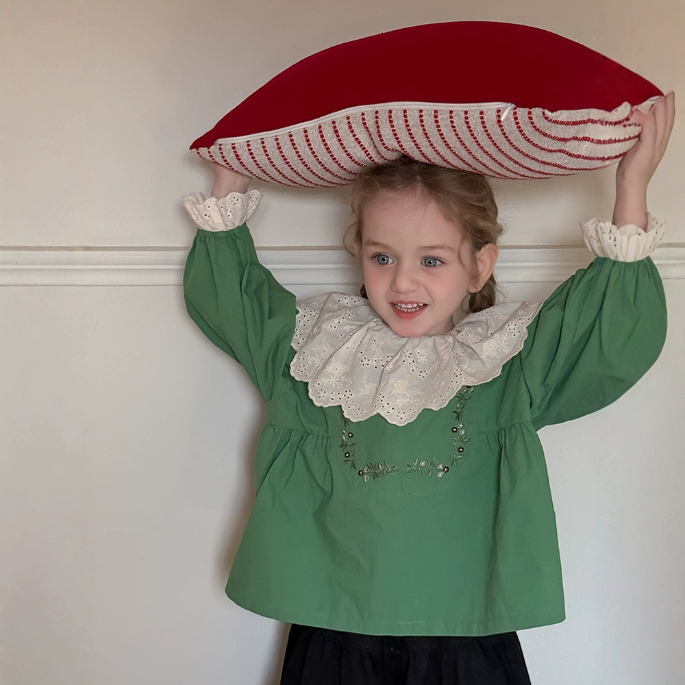 2025春の女の子の韓系の純色の気質はネットの赤い灯籠の袖の子供のシャツを刺繍します。