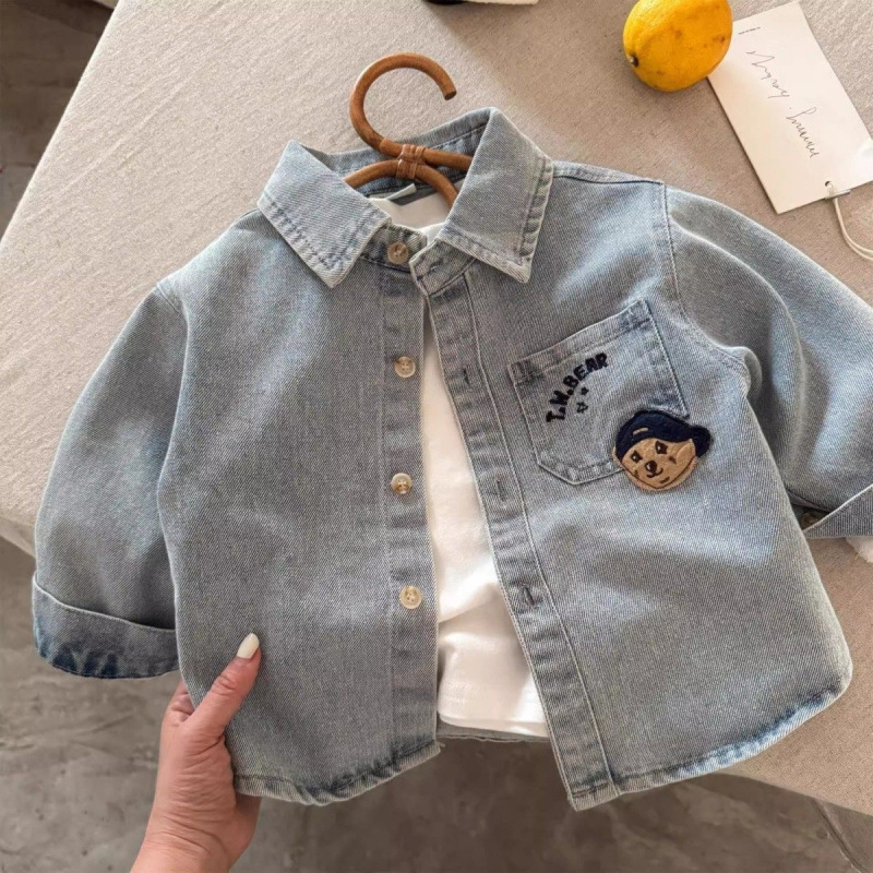 子供のクマシャツ 2025 春と秋の新しいスタイルの刺繍クマシャツ男の子と女の子のための漫画古いデニムジャケットトレンディな