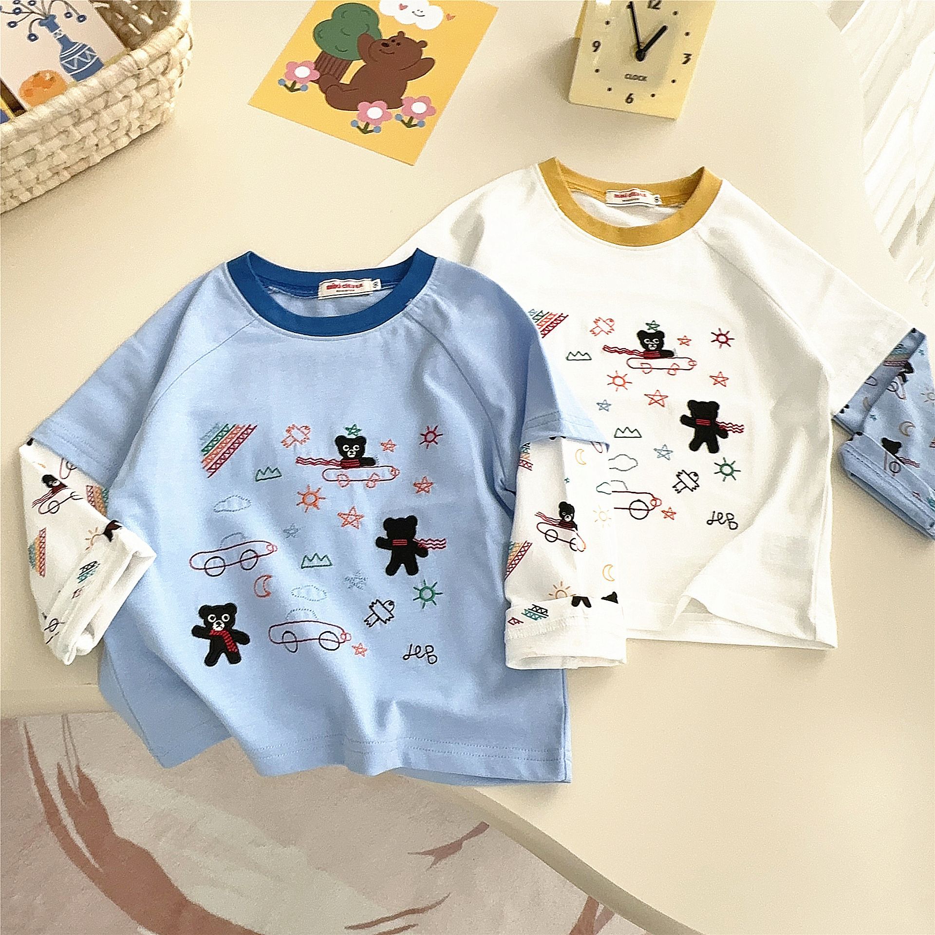 子供の長袖のtシャツの25春の新しい日系の男女の子供の赤ちゃんの偽の2つの熊の車の上着の長袖のtシャツの7036