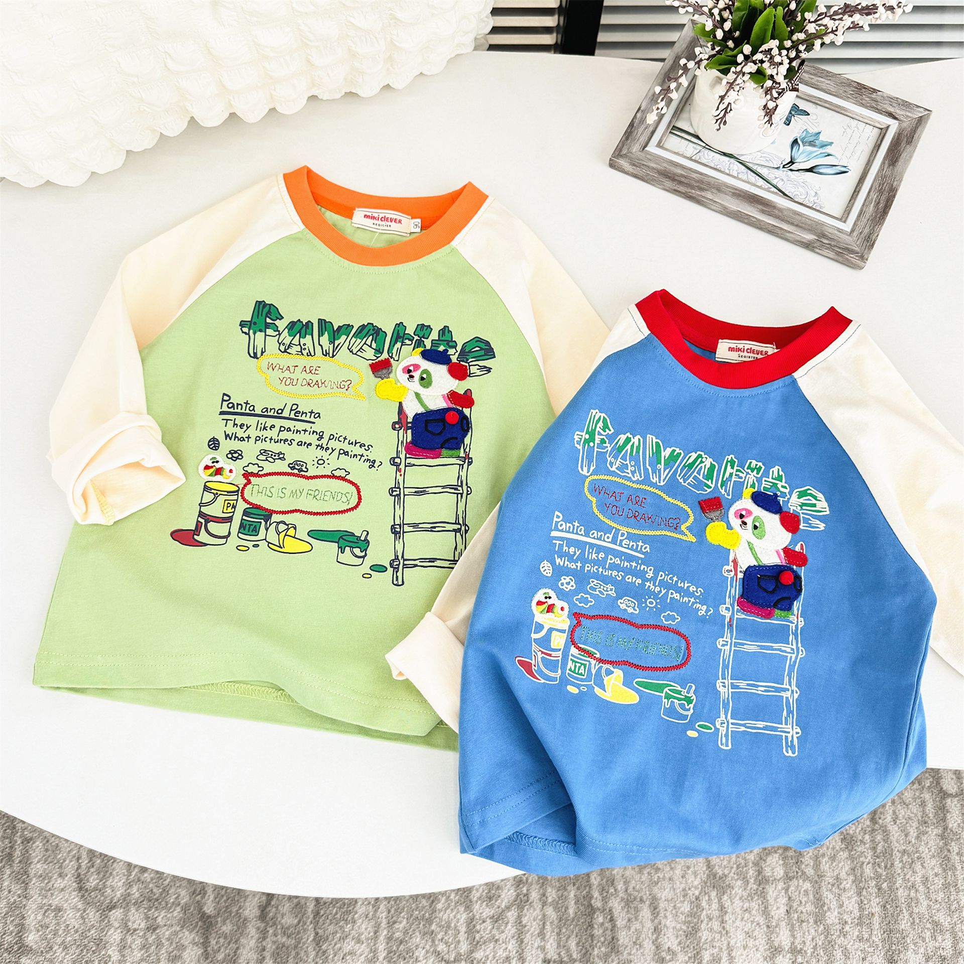 男の子と女の子春夏子供服20255新しいミキ漫画クマネイビー刺繍長袖多用途Tシャツ新しい