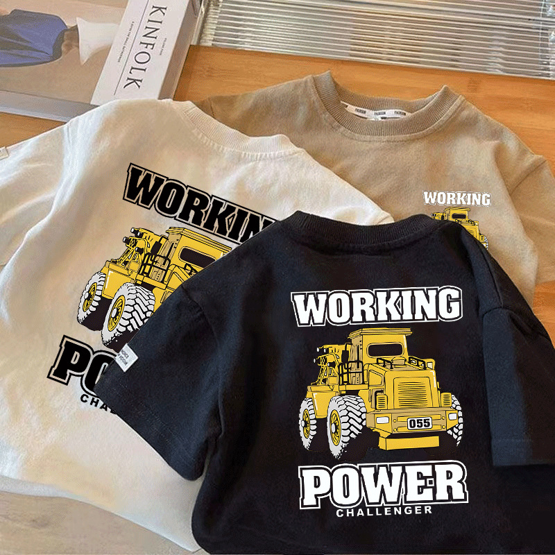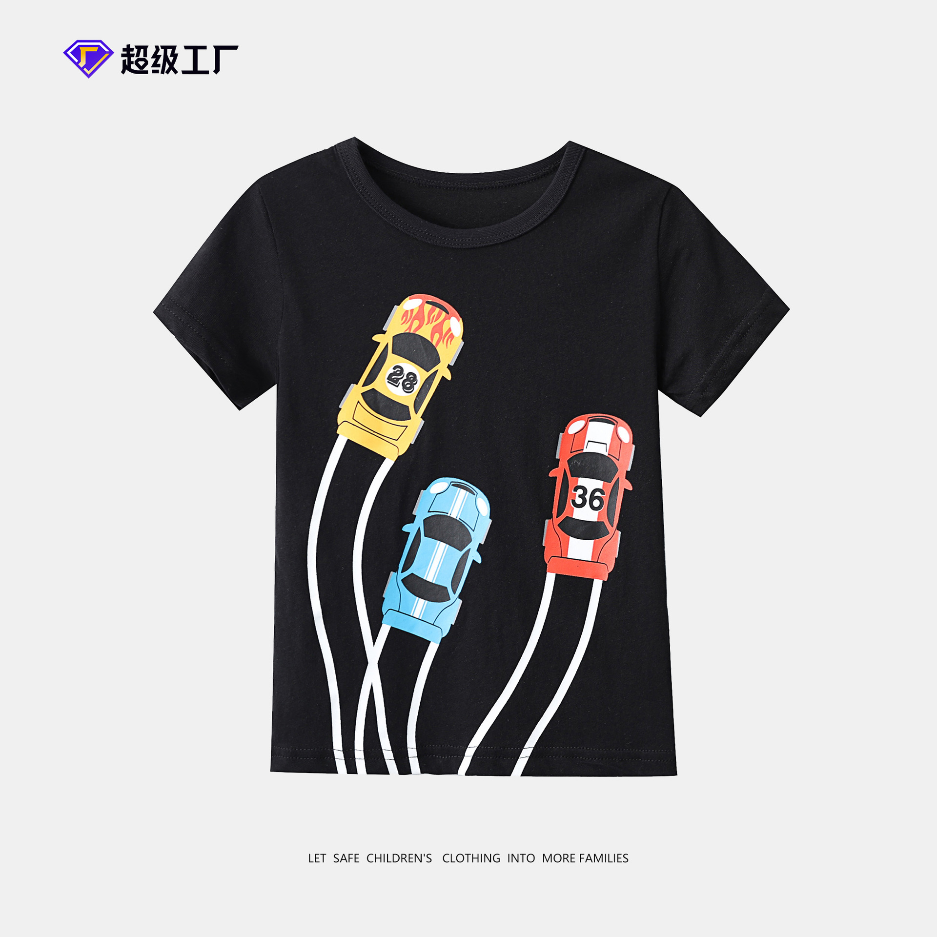 ヨーロッパとアメリカンスタイルの漫画純綿クラス A ボトリングラウンドネックシャツ子供の黒の車半袖トップ男の子 Tシャツ卸売