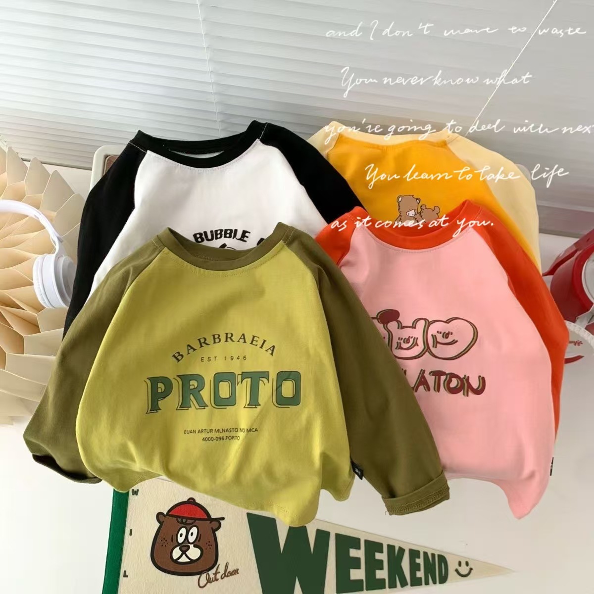 2024春秋の新型子供服の色合わせの男女の子供のかわいい熊のプリントの丸首は肩の袖の中の子供のtシャツの潮を挿します。