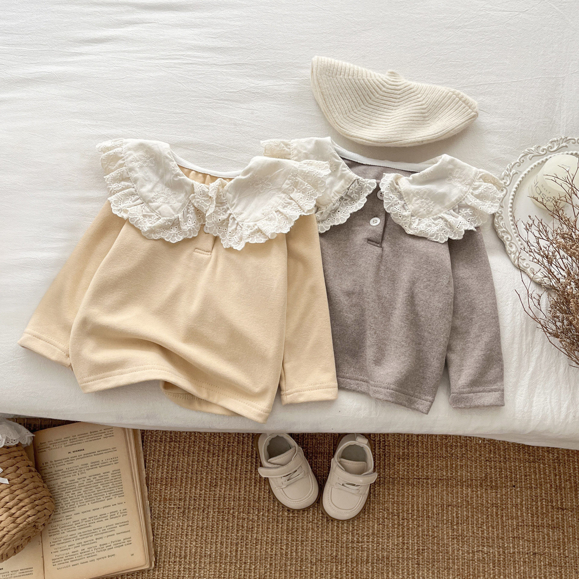 春と秋の新白ラペル子供カジュアルボトリングシャツ女の子人形襟レースアウターベビー長袖 Tシャツ