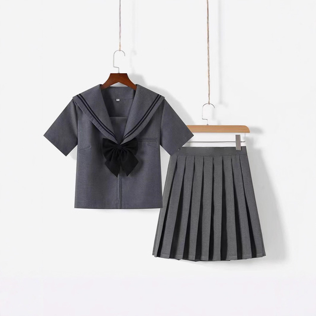 日本正統派JK制服 グレーのツーピースセーラー服 学生服 カレッジ風 春秋 半袖・長袖 プリーツスカートセット