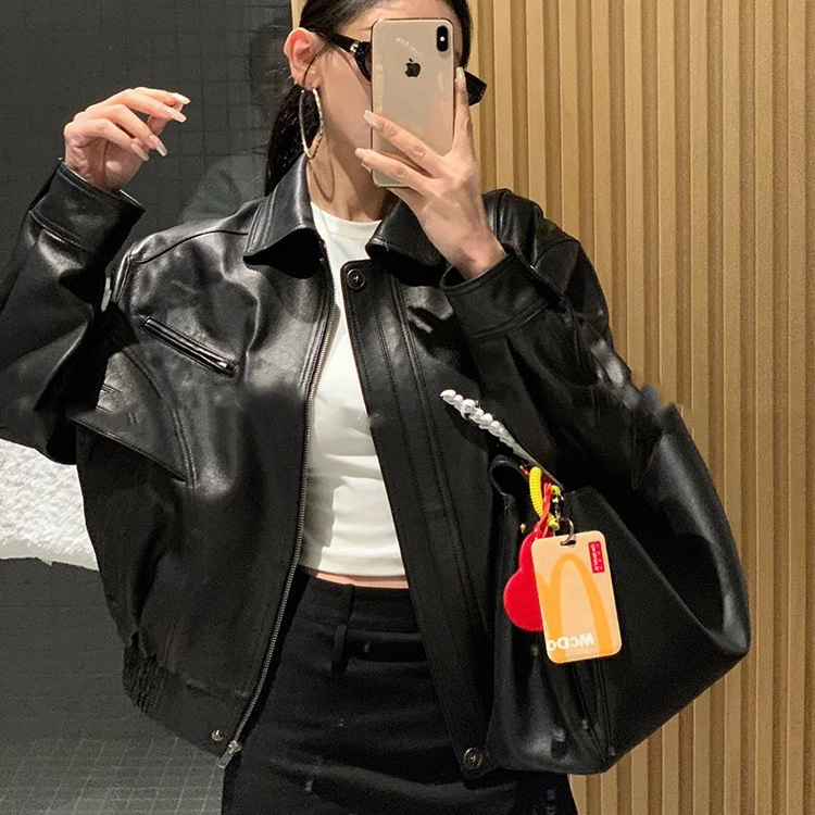 【カスタマイズ】秋冬ファッションシンプルな純色革ポケットディテール長袖ゆるい短い機関車ジャケット皮服