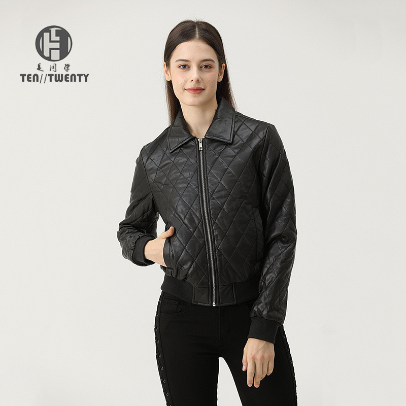 【オーダーメイドのリンク】外国貿易の女性の革の服のジャケットの菱の形の格のpu皮の綿の服のコートは図に来て形の加工を代行します。