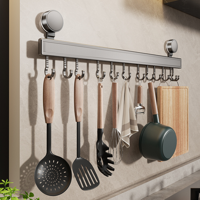 吸盤キッチンフック一列スライドレール吊り棒穴なしスペースアルミ鍋シャベル収納壁掛け式ハンガーラック