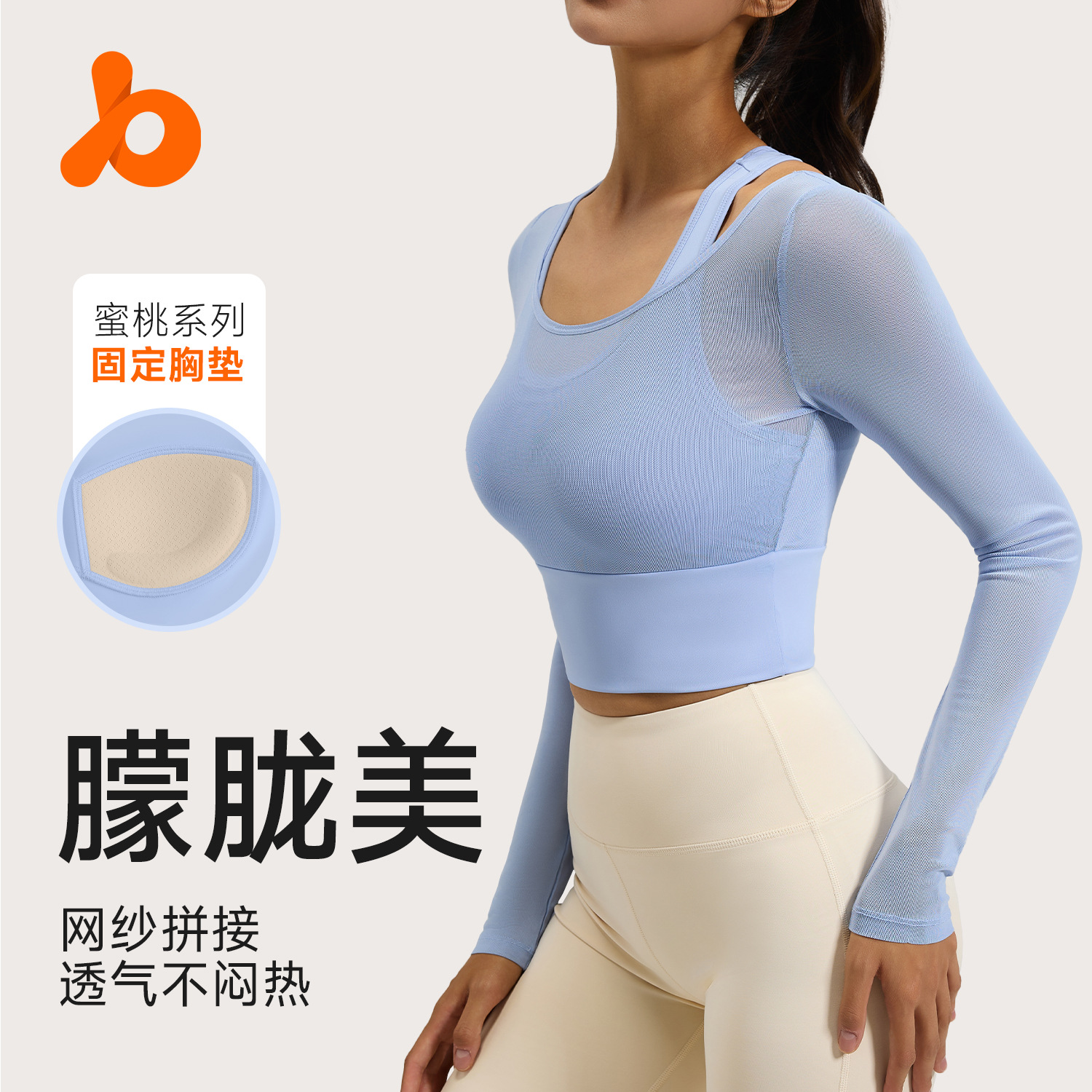 Juyitang 春と秋の新しいメッシュフェイクツーピースヨガ服トップブラなしスポーツフィットネス服長袖
