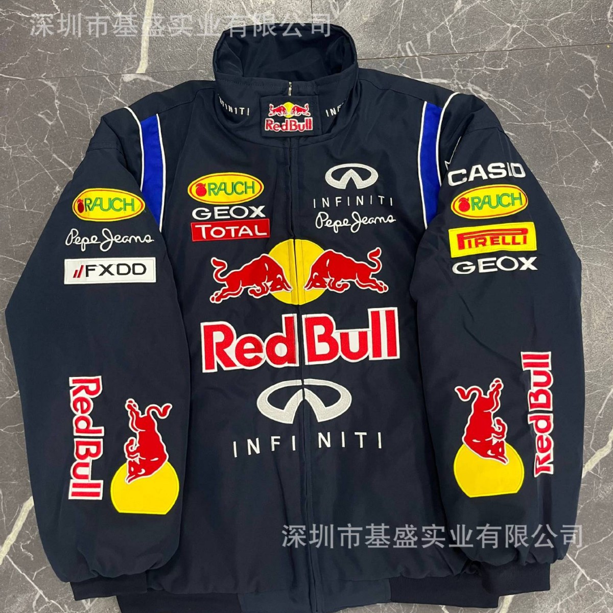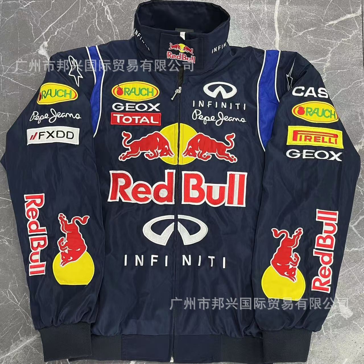 F1刺繍レーシングスーツ、越境人気商品レッドブルライディングスーツ、アメリカンバイクウェア、紺色長袖コットンジャケット、カスタムメイド
