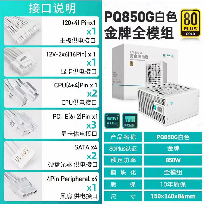 九州風神 PQ850G ゴールドメダルフルモード電源ネイティブ ATX3.1 インターフェース日本製コンデンサ FDB ファン 850 ワット