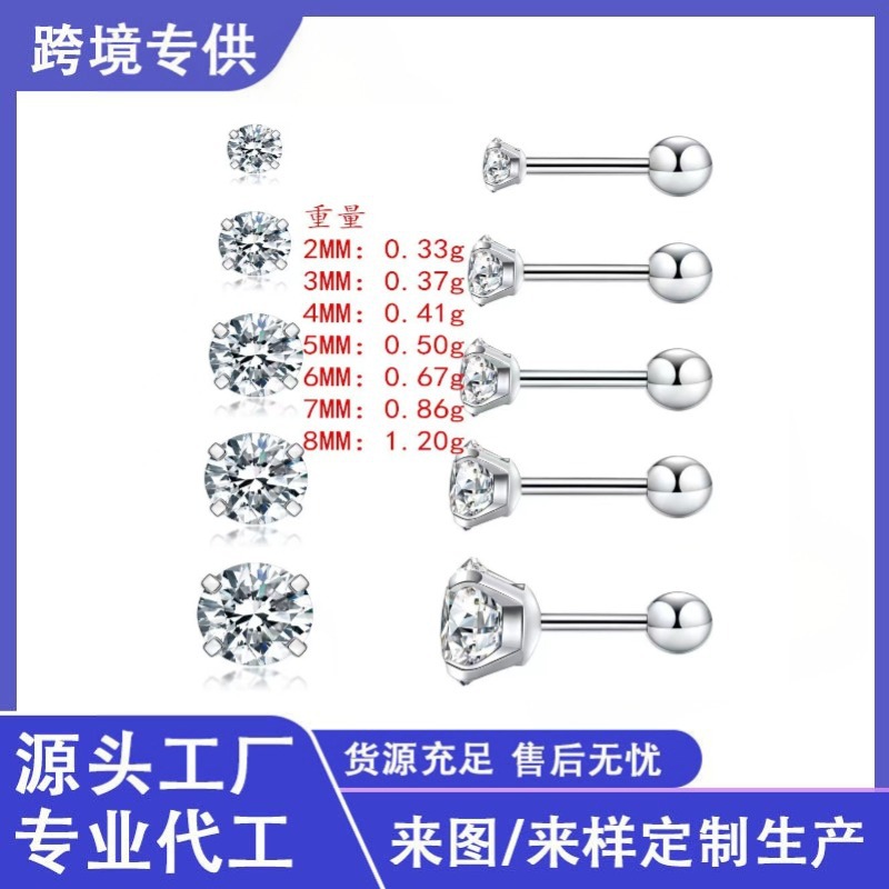越境直販アマゾン同型316ステンレス一体型4爪ジルコンピアス バックネジ式スチールピアス