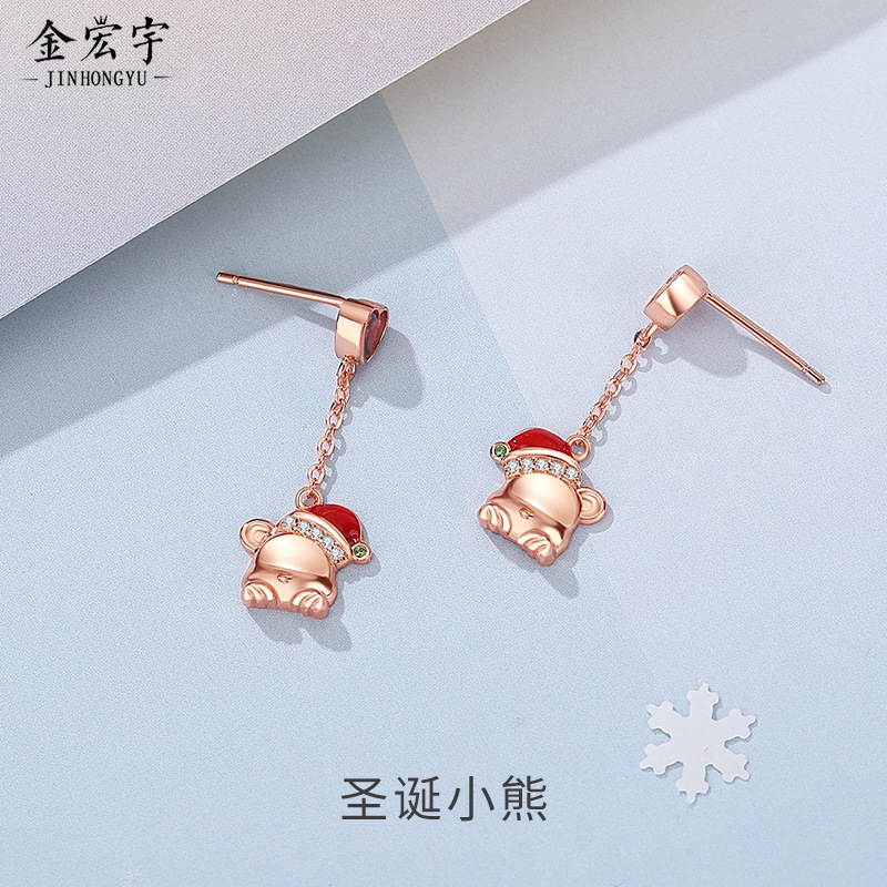 オリジナルクリスマス熊ピアス女925純銀小衆バラ金イヤリング微入れジルコン耳飾り代発