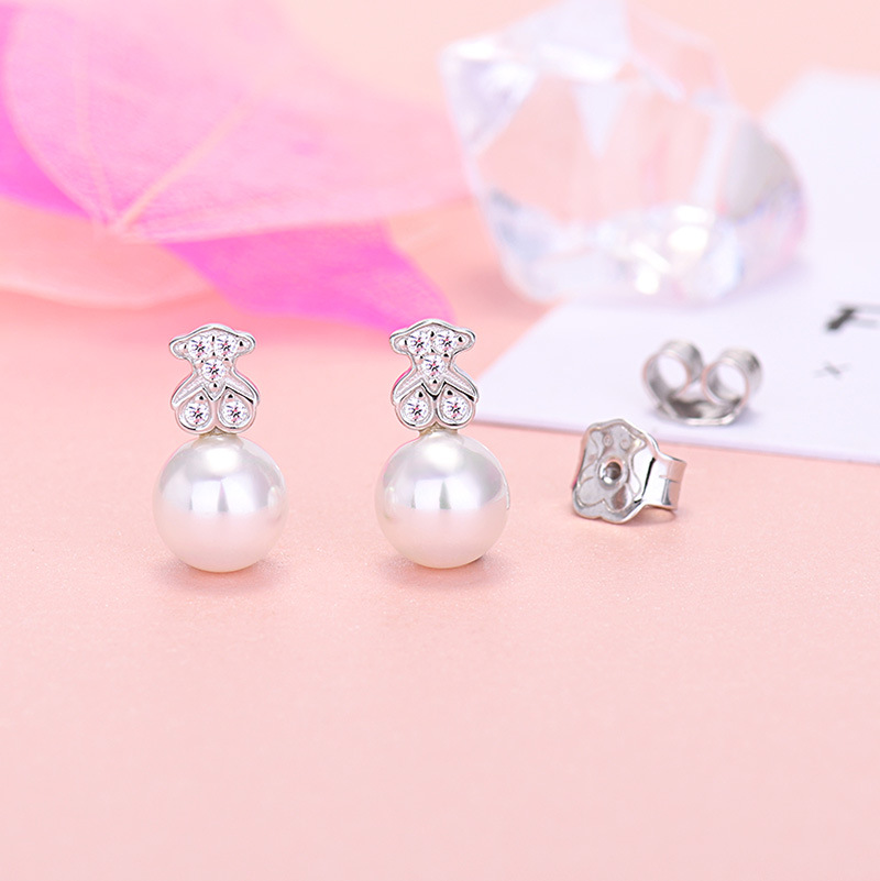 桃糸熊S925純銀精緻熊ピアスプラチナ真珠軽豪華ジルコン高級感女性ピアスクロスボーダー