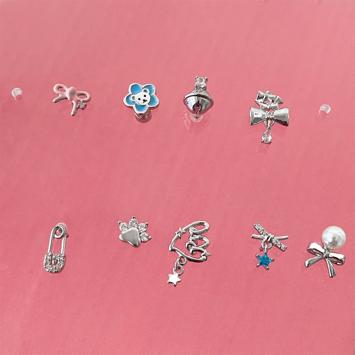 S925銀針韓国アニメかわいいベアーイヤリング青い蝶ネクタイデザイン感ピアス耳クリップ耳のない女性