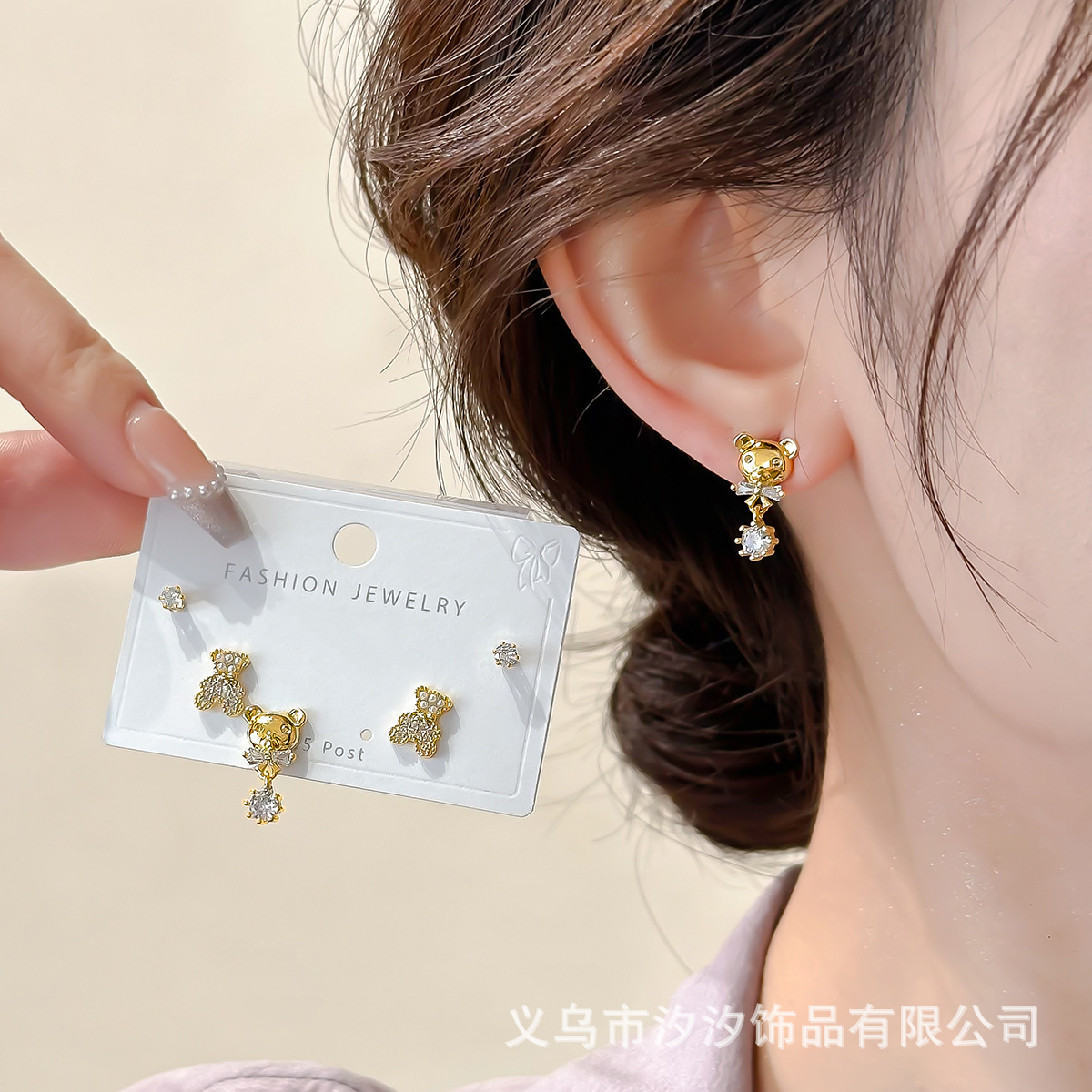 軽くて豪華でファッショナブルでかわいいダイヤモンドがちりばめられたクマのイヤリングの3点セット、絶妙でコンパクトで多用途なデザインのイヤリング卸売