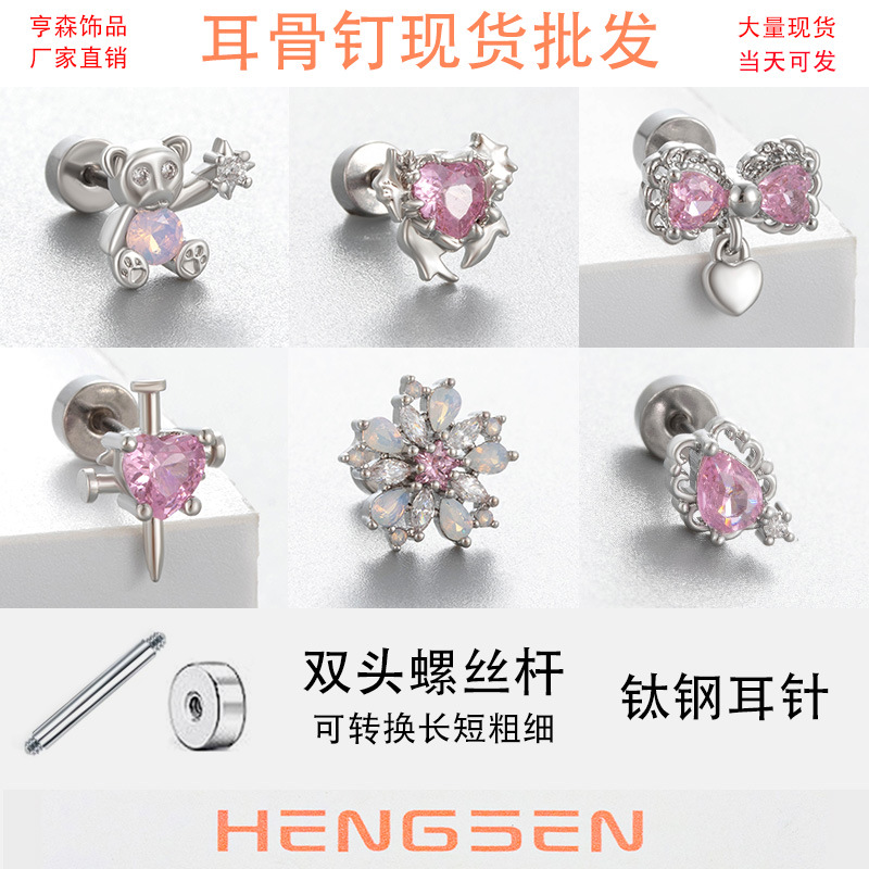 925純銀のかわいいピンクのドリルの熊のねじのピアスの女性insの個性の設計の耳の骨の釘のシンプルな百合の耳の装飾品
