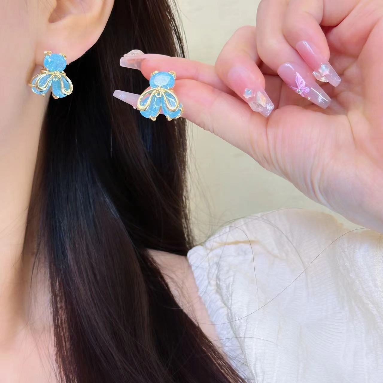 青い蝶結びのイヤリングは小さくて精巧で、ミニモデルの2024熊の立体イヤリングの甘美な気質の少女の耳飾りです。