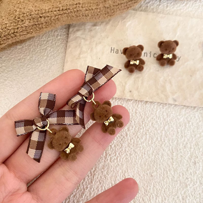 アメリカの学院風のカレー色の蝶結びの熊のピアスの女性の秋冬の高級感の独特なイヤリングのかわいい植毛のイヤリング