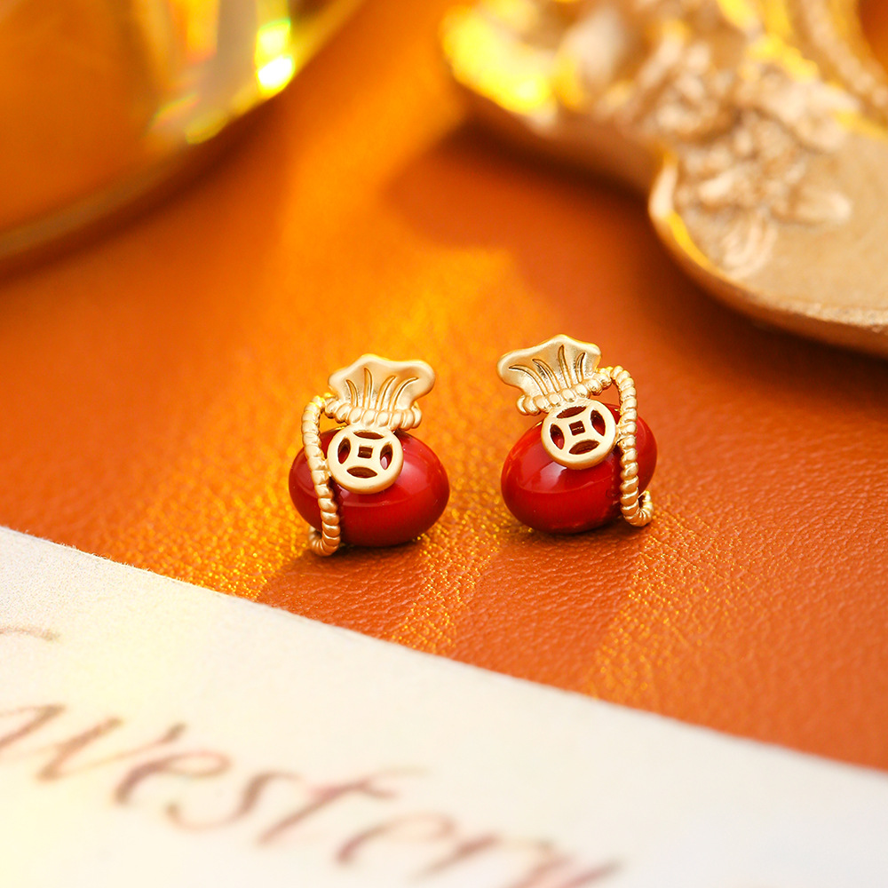 ティチ925純銀南紅瑪瑙ピアス女性本命年赤いイヤリング国風レトロ小銭袋耳飾り