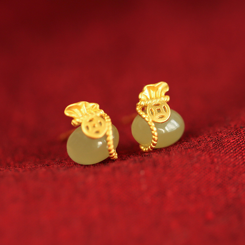 国潮天然和田玉ピアス女性s925純銀福金銭袋イヤリング復古玉耳飾り卸売り