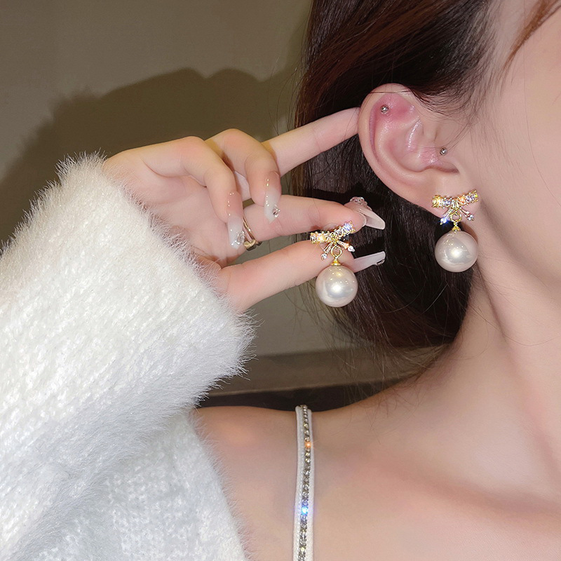 Douyin ホット販売蝶結びダイヤモンドパールイヤリング女性のライト高級ハイエンドイヤリングロングタッセルジルコンイヤリング