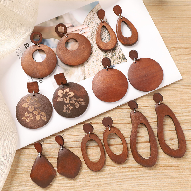 アンティークブラウンカレー色の木製ピアス小衆港風美ラード誇張円形イヤリング民族風イヤリング女性
