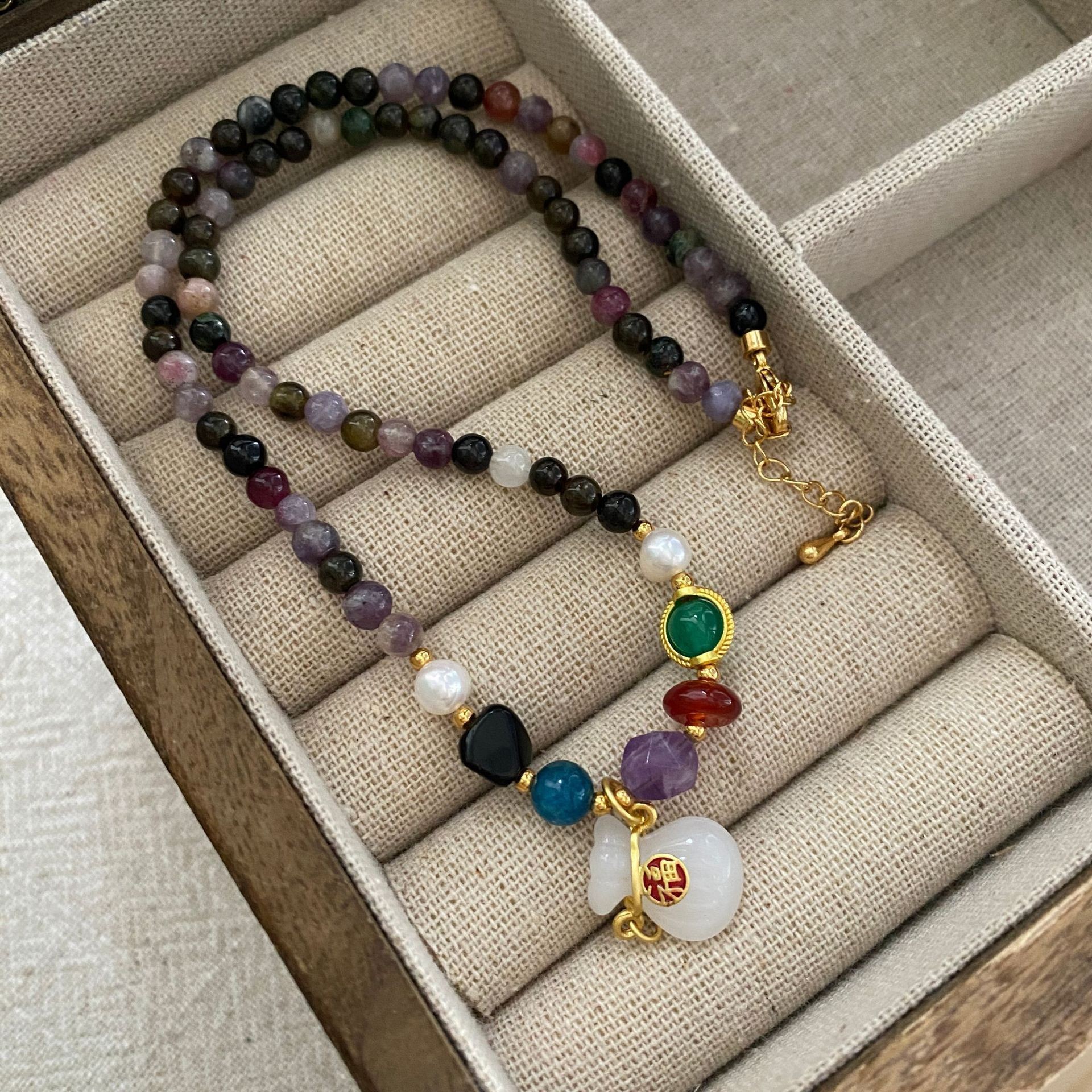 新しい中国風の天然石ビーズネックレス、多用途でハイエンドのニッチマネーバッグ、ファッショナブルなレトロなカラフルなパープルネックレス